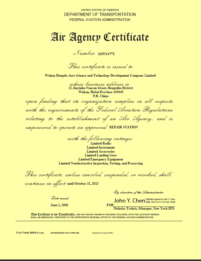 2019年11月 徑河廠區獲得CAAC、FAA維修許可。